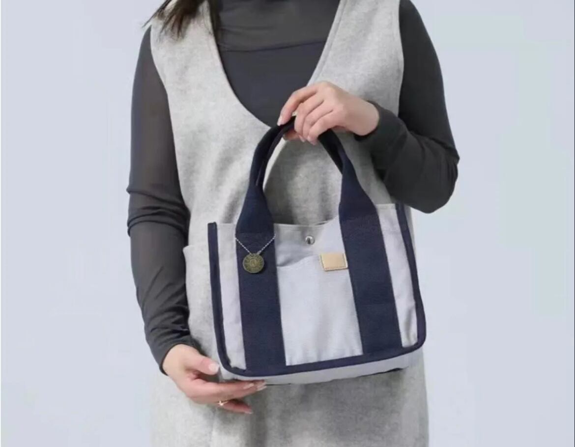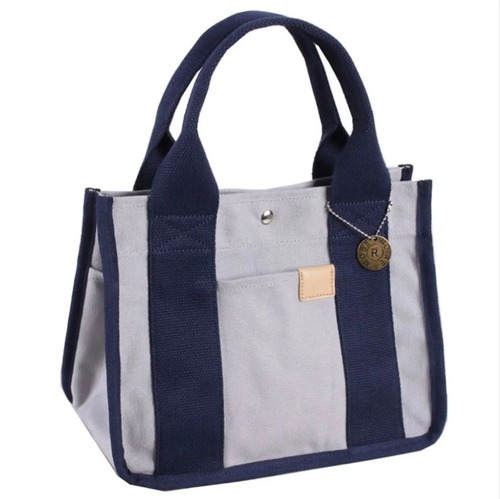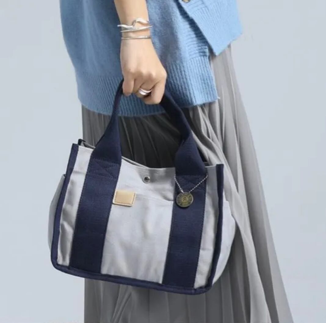 レディース帆布ミニトートバッグ|2室仕切り付き|丈夫で軽量|ランチ・タブレット収納可|ゴールドチャーム付き グレー/ネイビー