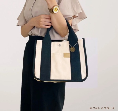 レディース帆布ミニトートバッグ|2室仕切り付き|丈夫で軽量|ランチ・タブレット収納可|ゴールドチャーム付き 白/黒