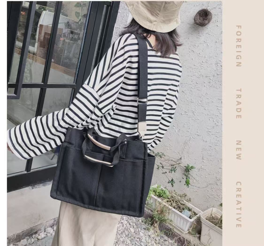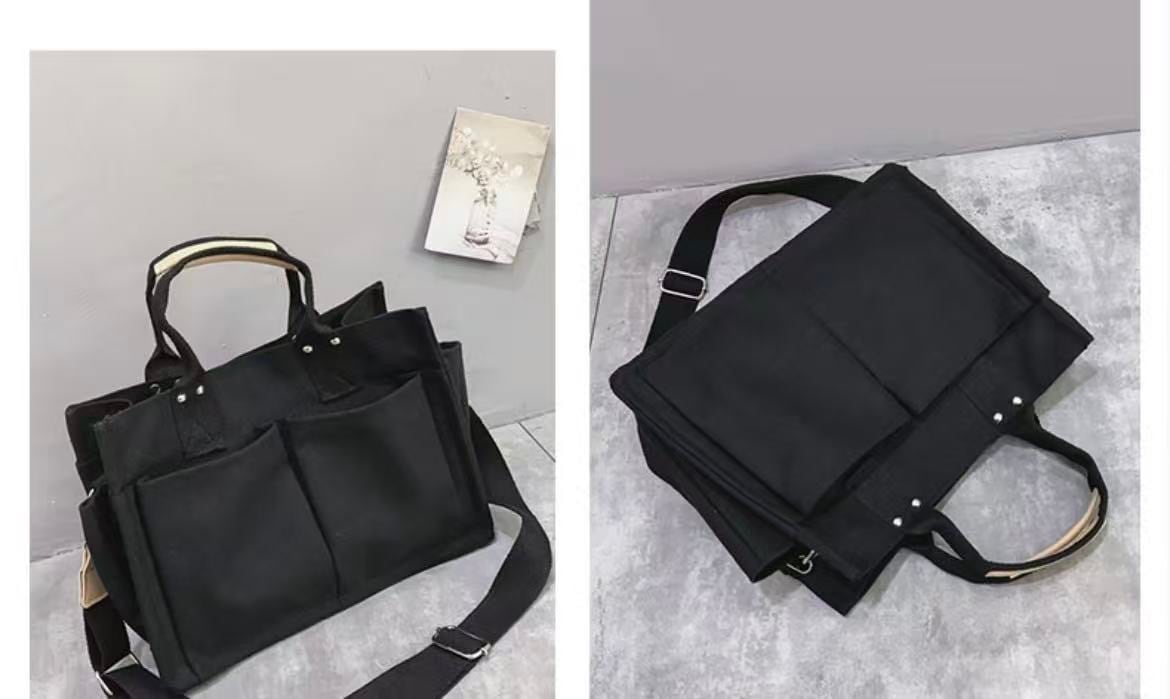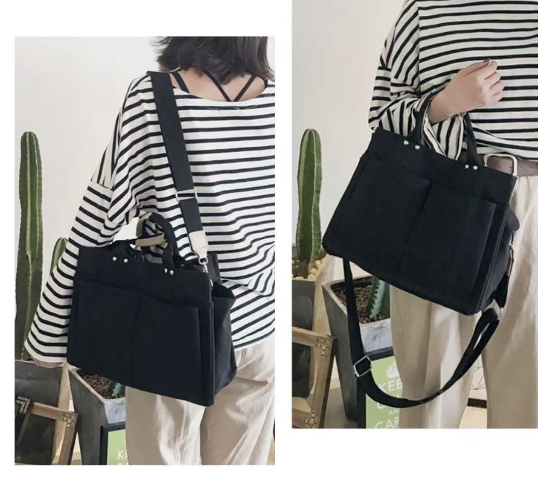 帆布大容量托特包 2way手提斜挎 多口袋マザーズバッグ レディース 通学 通勤 黒