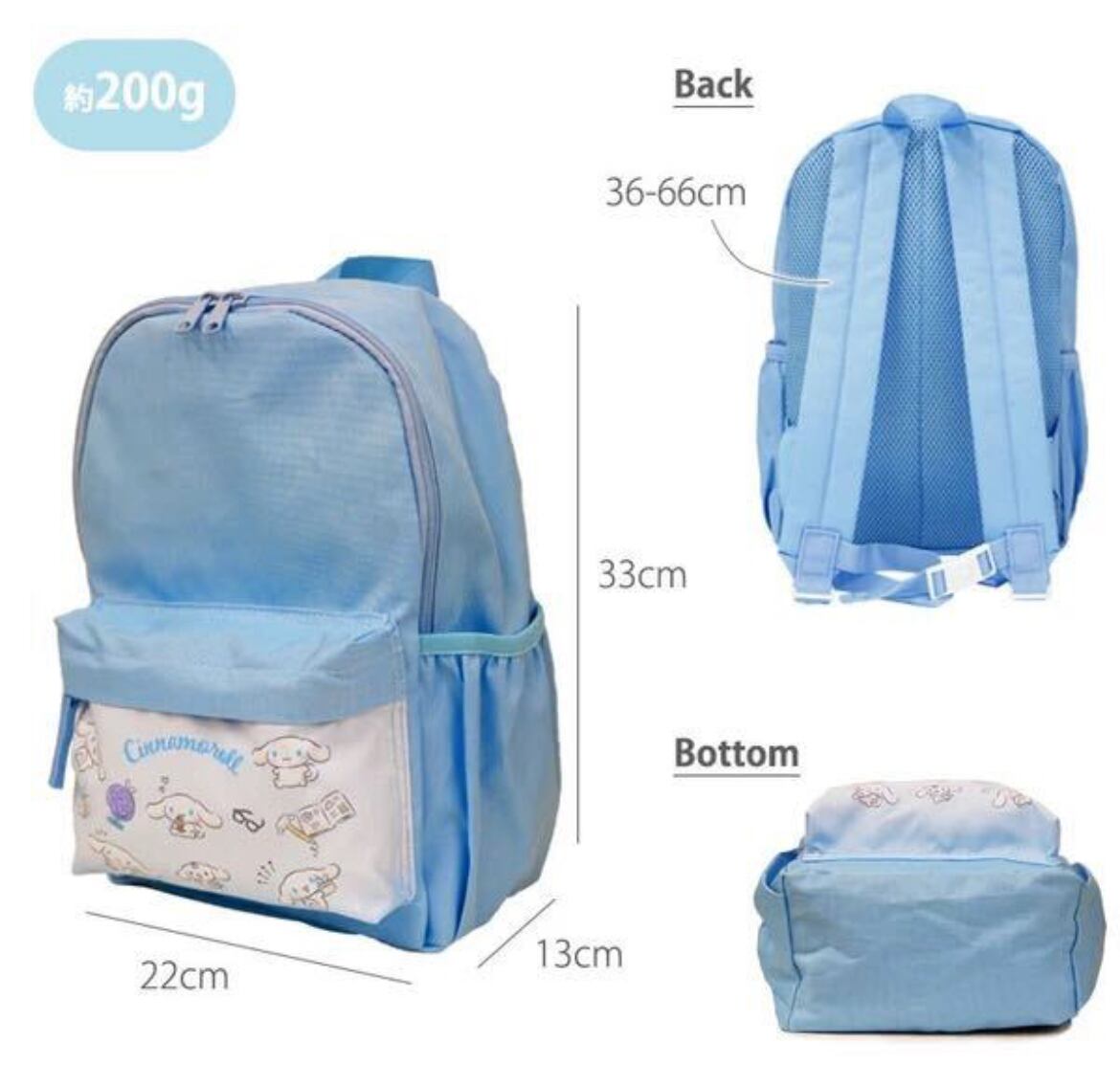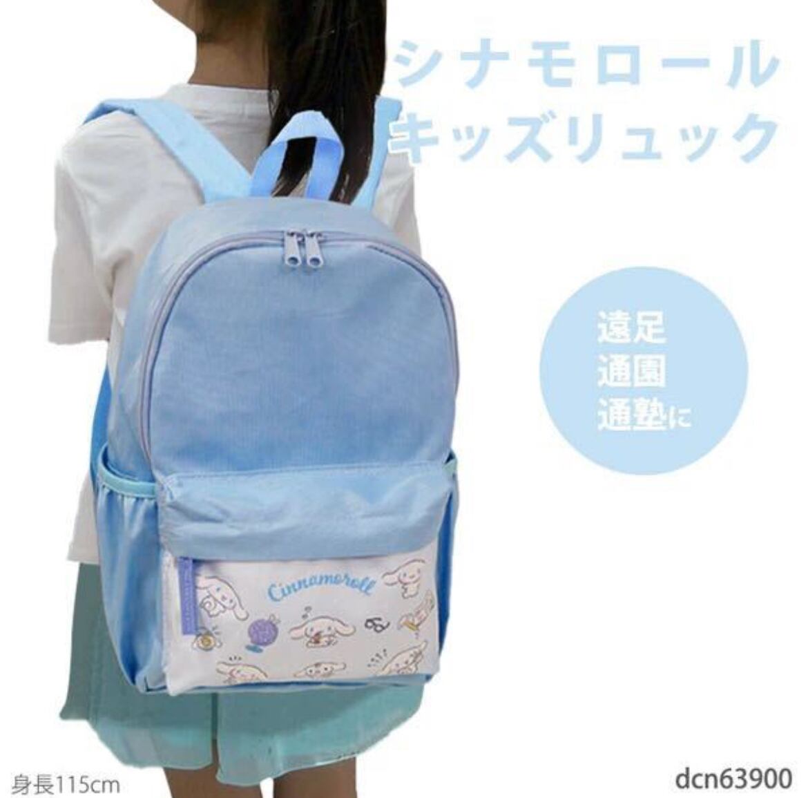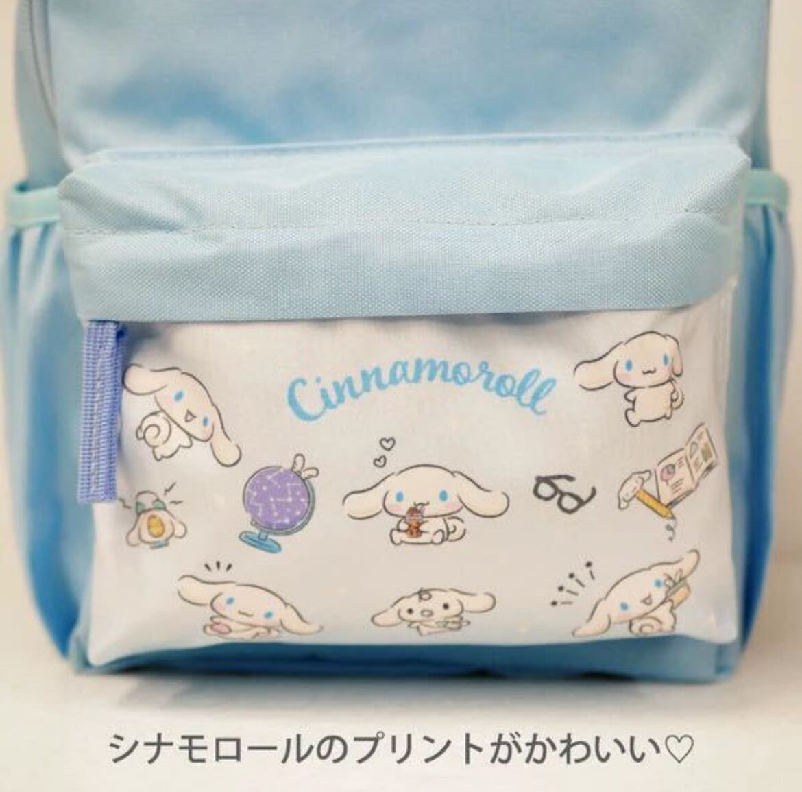 サンリオの人気キャラ・シナモロールがプリントされたかわいいジュニアリュック。A4ノートがぴったり入るサイズ感と広めのマチで遠足にも◎